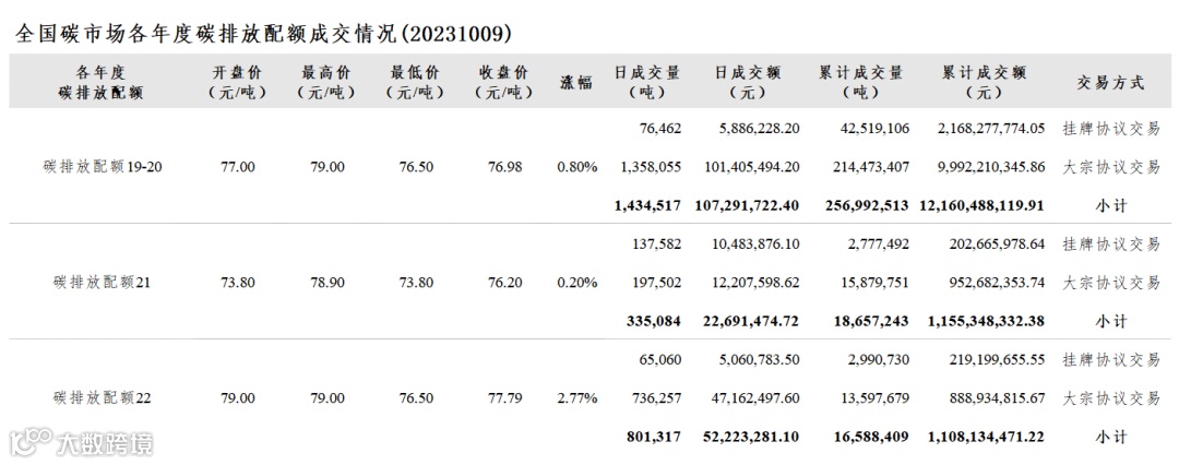 【行情】全国碳市场每日综合价格行情及成交信息20231009