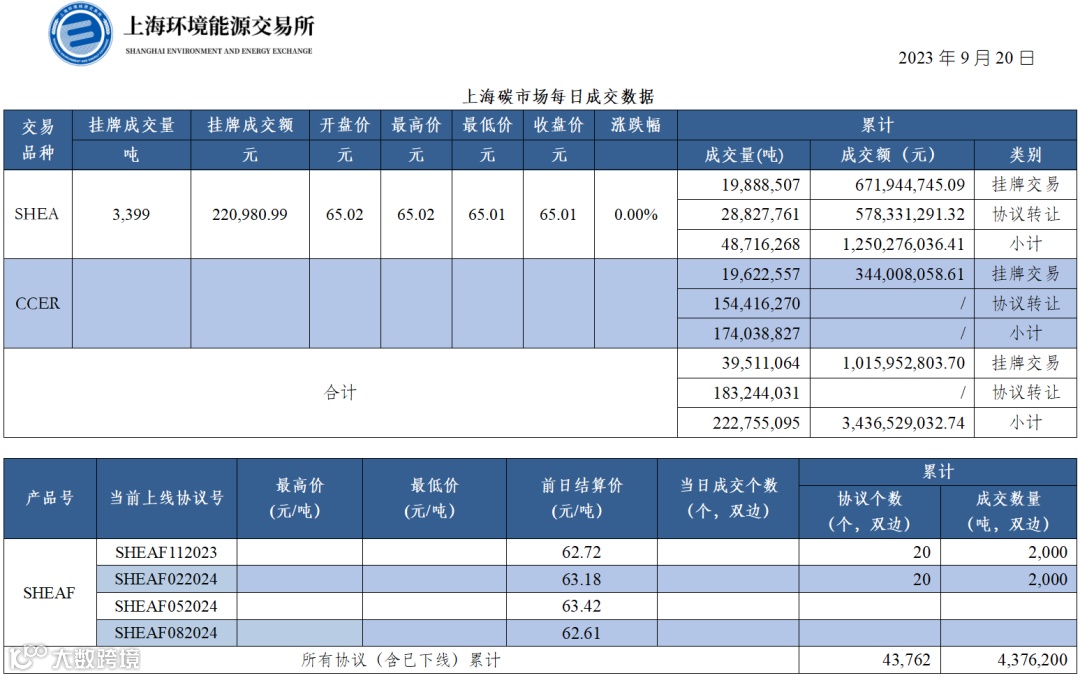 碳市场SHEA挂牌交易成交3,399吨,成交额220,980.99元,收盘价65.01元/吨,与上一交易日收盘价持平。