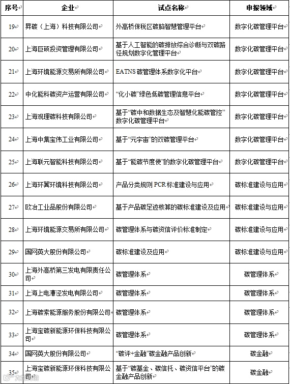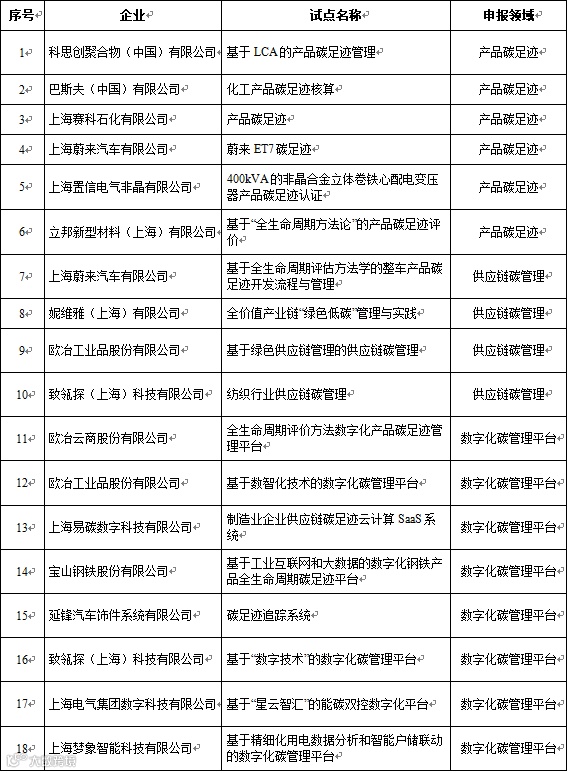 夫、蔚来汽车、立邦等参与试点。在数字化碳管理平台领域,欧冶云商、上海易碳、延锋汽车等率先试水。在碳金融领域有上海宝碳新能源环保科技有限公司等参与。