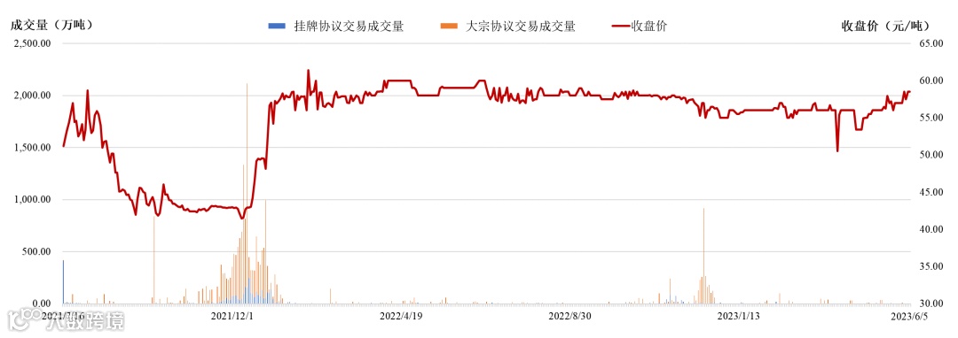 自 2021年7月16日上线交易以来,截至2023年6月5日,全国碳市场共运行457个交易日,碳排放配额累计成交量2.35亿吨,累计成交金额107.92亿元,每日收盘价在40-60元/吨之间波动,近一周收盘价在58元/吨左右。全国碳市场上线运行以来,市场运行平稳有序,交易价格稳中有升,主体有序参与交易,企业减排意识不断提高。