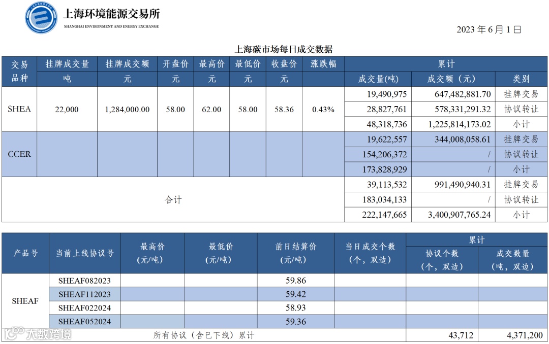 碳市场SHEA挂牌交易成交22,000吨,成交额1,284,000.00元,收盘价58.36元/吨,较上一交易日收盘价上涨0.43%。