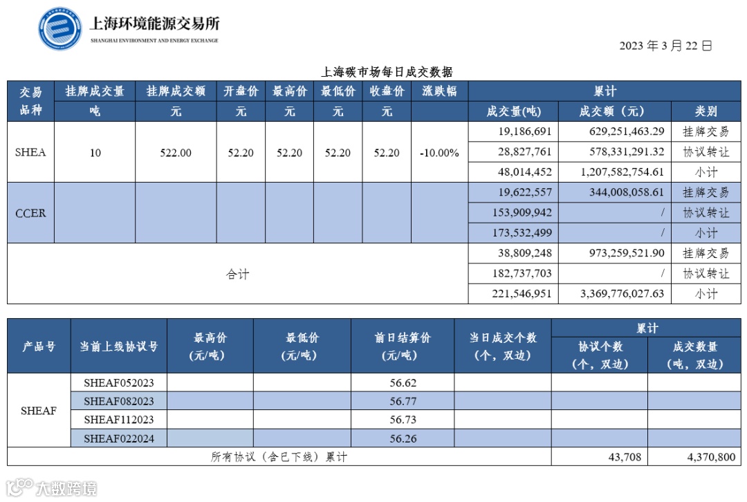 【行情】上海碳市场每日成交数据20230322