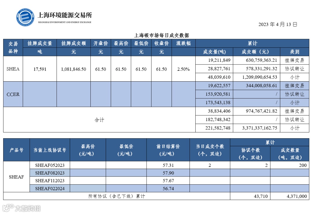 【行情】上海碳市场每日成交数据20230413