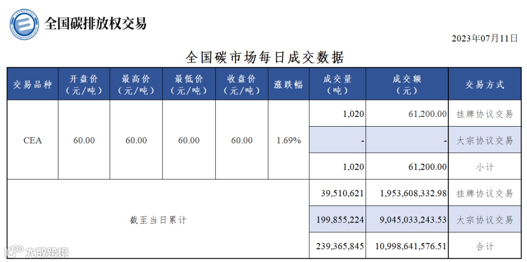 截至今日,全国碳市场碳排放配额(CEA)累计成交量239,365,845吨,累计成交额10,998,641,576.51元。