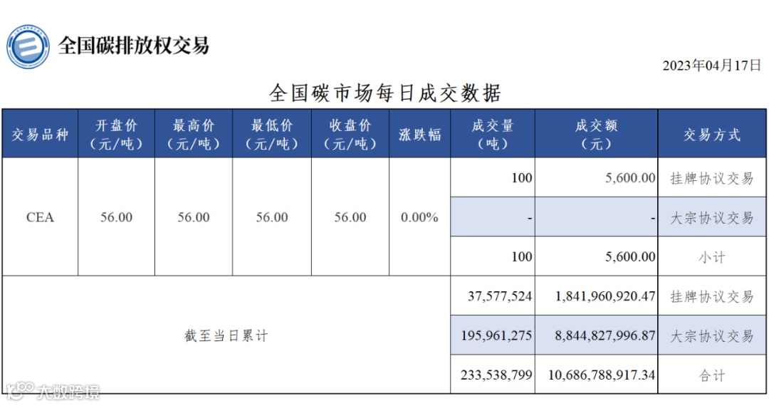 截至今日,全国碳市场碳排放配额(CEA)累计成交量233,538,799吨,累计成交额10,686,788,917.34元。