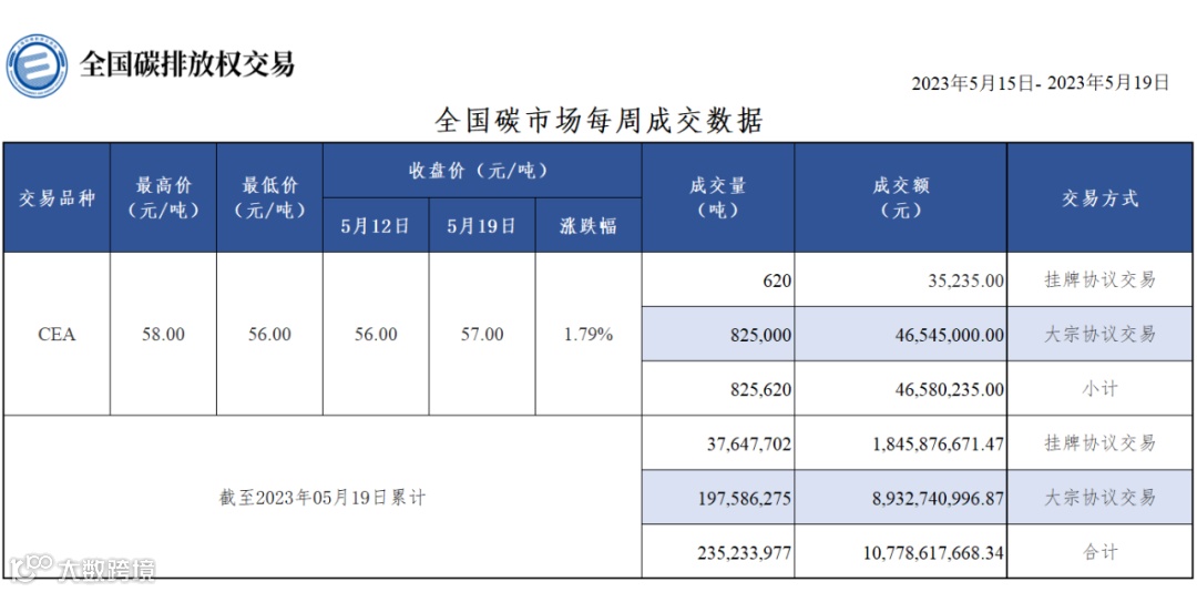 截至本周,全国碳市场碳排放配额(CEA)累计成交量235,233,977吨,累计成交额10,778,617,668.34元。