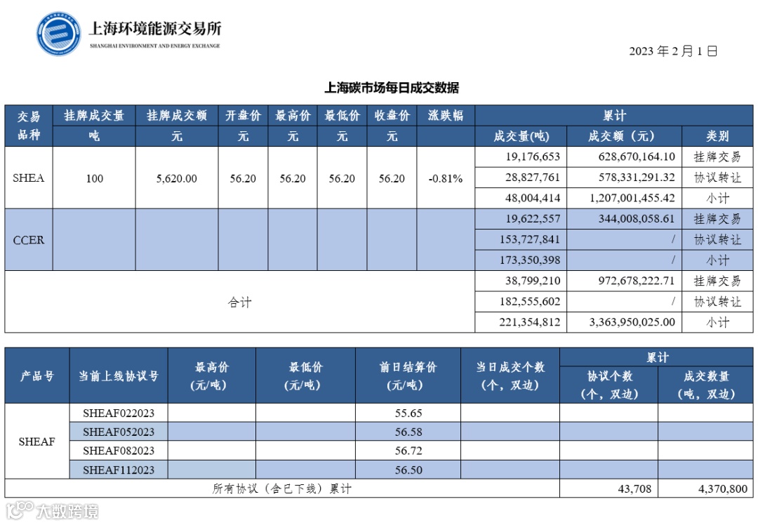 碳市场SHEA挂牌交易成交100吨,成交额5,620.00元,收盘价56.20元/吨,较上一交易日收盘价下跌0.81%。
