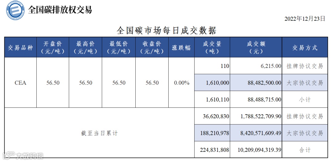 截至今日,全国碳市场碳排放配额(CEA)累计成交量224,831,808吨,累计成交额10,209,094,319.39元。