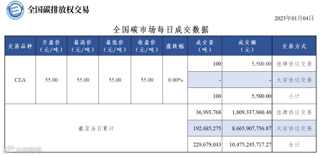 截至今日,全国碳市场碳排放配额(CEA)累计成交量229,679,043吨,累计成交额10,475,245,717.27元。
