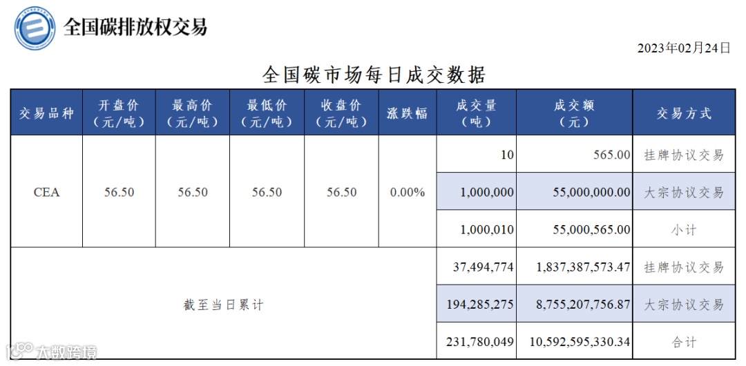 【行情】全国碳市场每日成交数据20230224