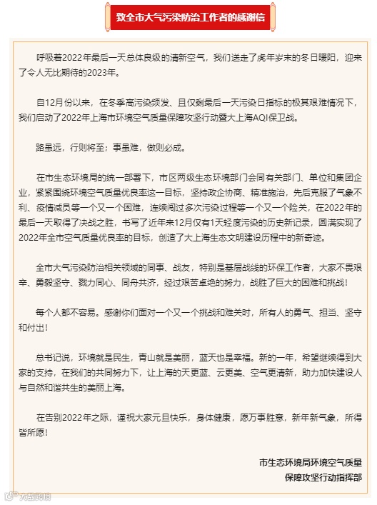 2023年第一天的上午,一封《致全市大气污染防治工作者的感谢信》在上海生态环保人的微信朋友圈里迅速传开,让大家在迎接新年、展望新年中,精神头更加振奋。