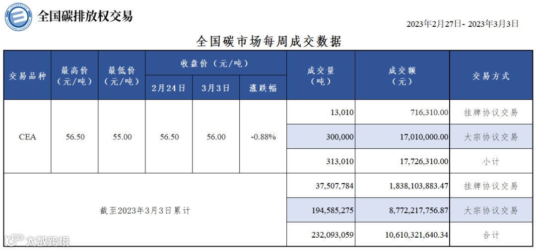 本周全国碳市场碳排放配额(CEA)总成交量313,010吨,总成交额17,726,310.00元。