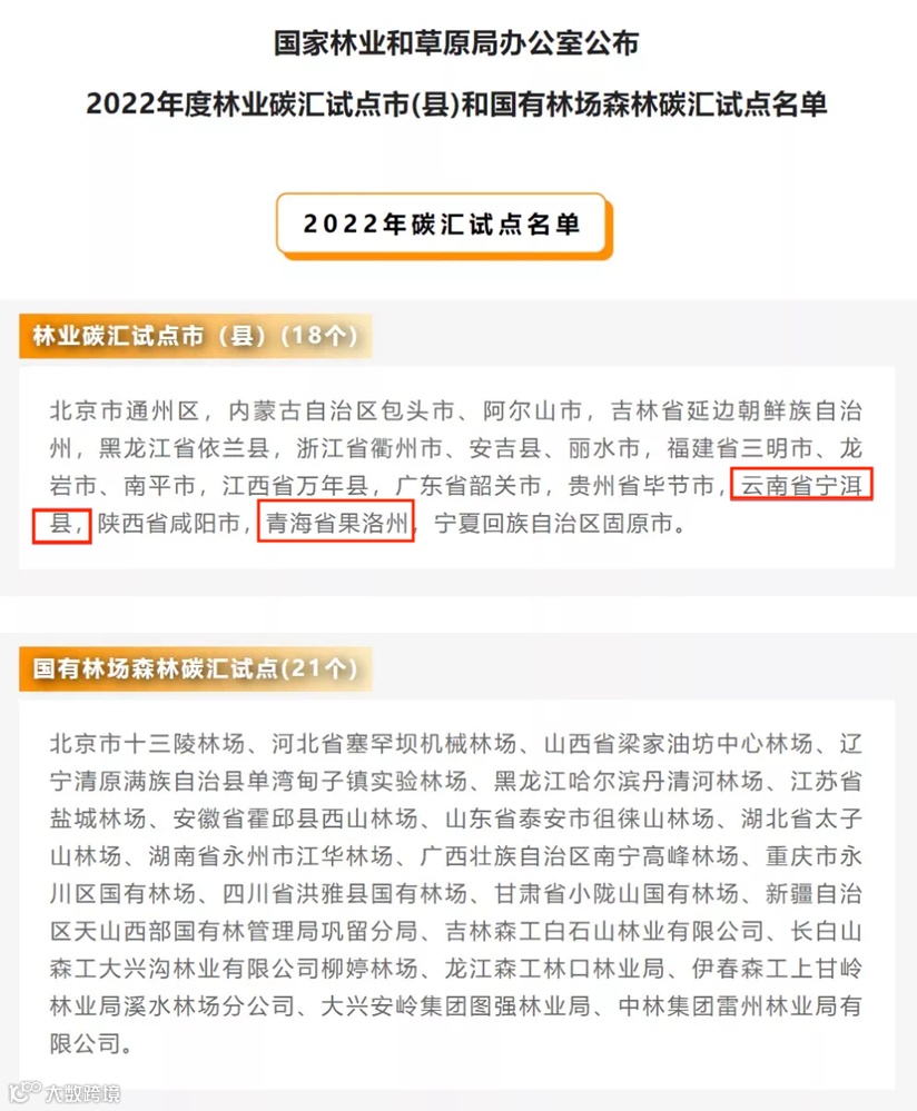 日前,国家林业和草原局办公室公布了2022年度林业碳汇试点市(县)和国有林场森林碳汇试点名单,全国共18个林业碳汇试点市(县)和21个国有林场森林碳汇试点。其中由上海环交所支撑申报的云南省宁洱县以及青海省果洛州也成功入选成为2022年度林业碳汇试点地区。