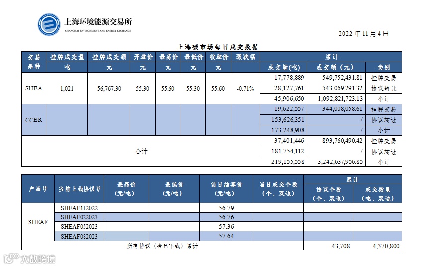 碳市场SHEA挂牌交易成交1,021吨,成交额56,767.30元,收盘价55.60元/吨,较上一交易日收盘价下跌0.71%;CCER协议转让成交557吨。