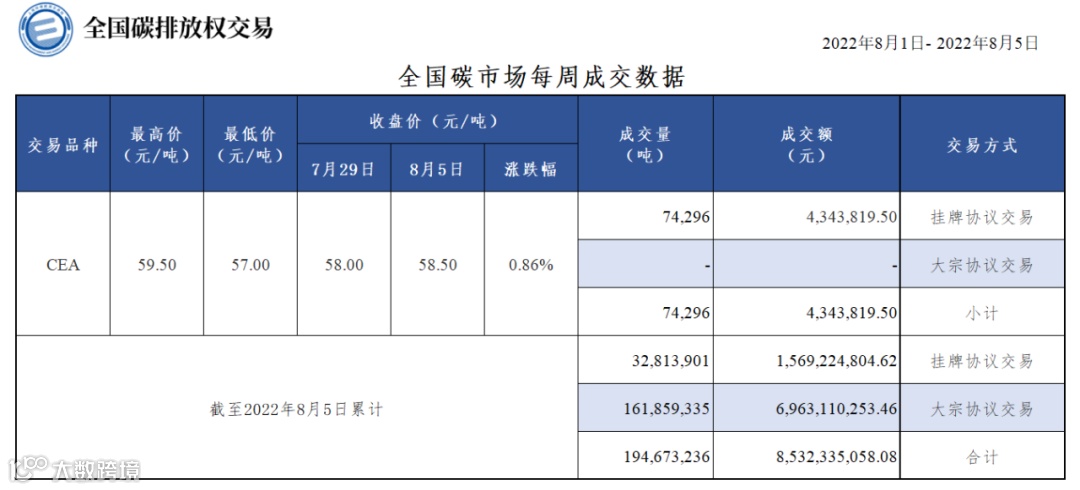 本周全国碳市场碳排放配额(CEA)总成交量74,296吨,总成交额4,343,819.50元。