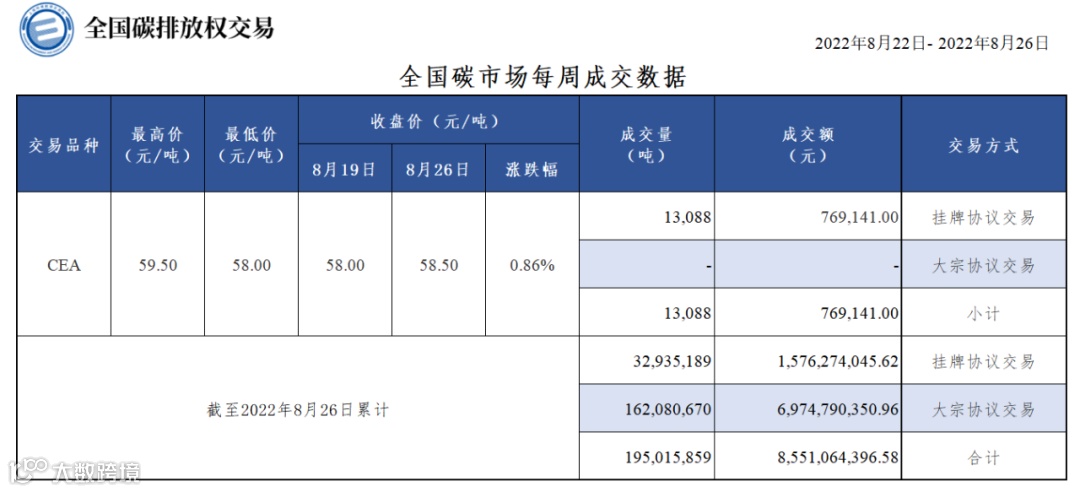 截至本周,全国碳市场碳排放配额(CEA)累计成交量195,015,859吨,累计成交额8,551,064,396.58元。