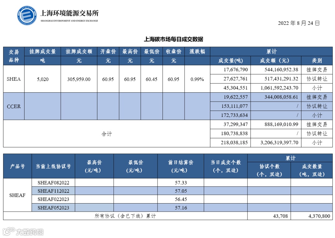 导读:今日上海碳市场CCER协议转让成交200吨。截止今日,上海碳市场所有现货品种累计成交量217,893,931