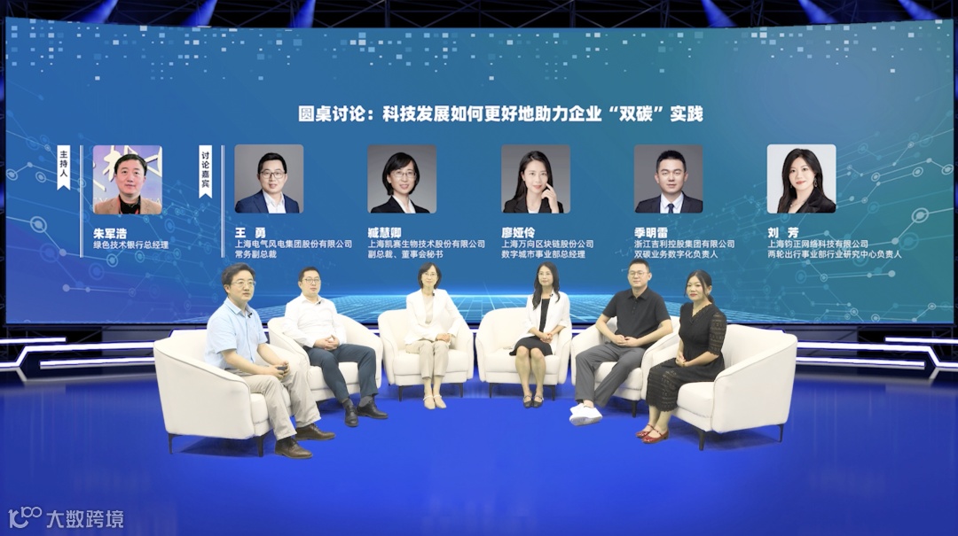 最后,围绕“科技发展如何更好地助力企业‘双碳’实践”的主题,六家碳中和行动联盟成员代表进行了热烈的讨论。圆桌讨论由绿色技术银行总经理朱军浩主持,上海电气风电集团常务副总裁王勇,凯赛生物副总裁,董事会秘书臧慧卿,万向区块链数字城市事业部负责人廖娅伶,吉利控股集团双碳业务数字化负责人季明雷以及上海钧正两轮出行事业部行业研究中心负责人刘芳以企业自身实践案例出发,从双碳战略部署及实践发展、低碳技术产品、工业领域数字化和碳普惠机制等方面进行全面分享,共同为企业如何通过科技手段实现“双碳”目标建言献策。