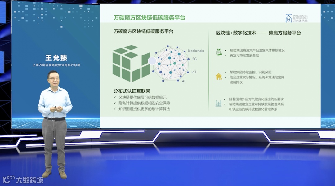 上海万向区块链股份公司执行总裁王允臻代表万向区块链也在云论坛上发布并介绍了基于区块链+数字化技术打造的万向区块链万碳魔方区块链低碳服务平台。该平台通过对区块链、物联网、安全云、知识图谱等多种数字化技术进行融合创新,为集团企业、工业园区等提供了可自由组合的定制化低碳解决方案。
