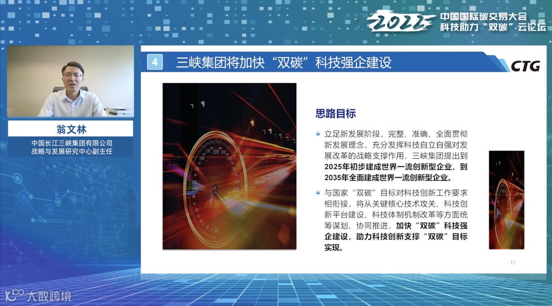 中国长江三峡集团有限公司战略与发展研究中心副主任翁文林在发言中指出,科技创新是”双碳“目标实现的关键引擎,他详细介绍了三峡集团在科技创新助力“双碳”目标实现的实践与探索、取得的初步成效及有关典型案例。三峡集团将加快推进“双碳”科技强企建设,不断提升服务支撑国家重大科技创新能力,助力经济社会绿色低碳转型发展。