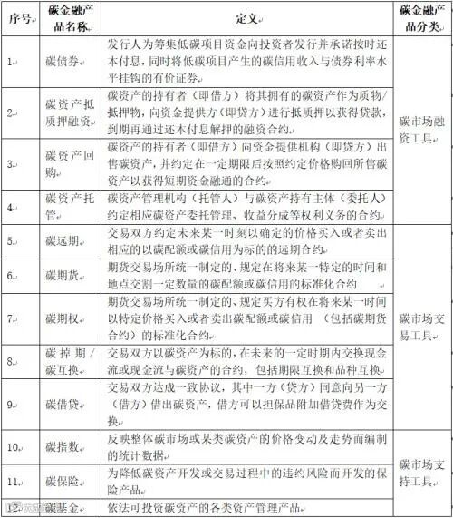 《碳金融产品》标准将碳金融产品划分为碳市场融资工具、碳市场交易工具和碳市场支持工具,并列举了典型的12种碳金融产品进行定义,见下表。