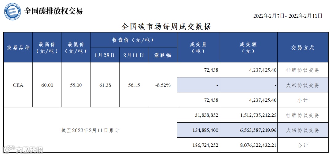 本周全国碳市场碳排放配额(CEA)总成交量72,438吨,总成交额4,237,425.40元。