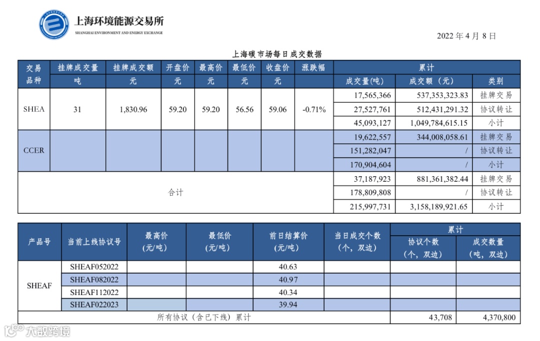 截止今日,上海碳市场所有现货品种累计成交量215,997,731吨,累计成交金额3,158,189,921.65元。其中,配额累计成交45,093,127吨,成交金额1,049,784,615.15元;CCER累计成交量170,904,604吨。上海碳配额远期产品累计成交数量4,370,800吨。