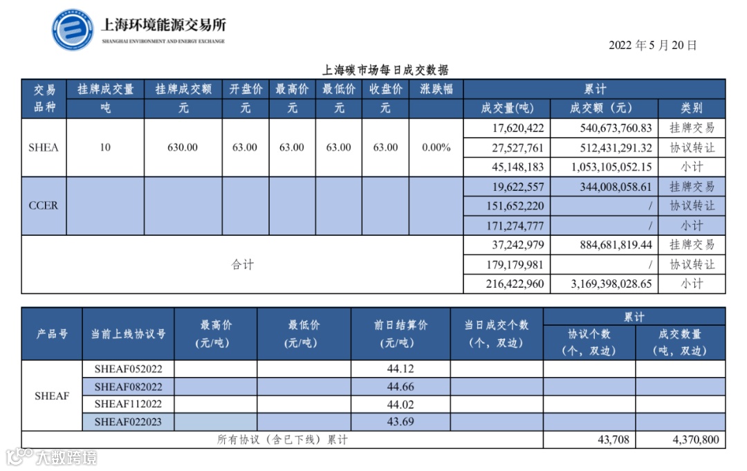 导读:今日上海碳市场SHEA挂牌交易成交10吨,成交额630.00元,收盘价63.00元/吨,较上一交易日收盘价持