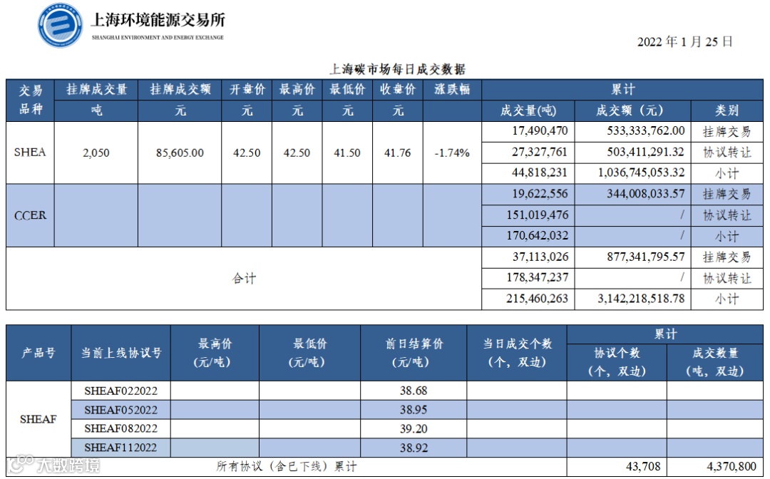 【行情】上海碳市场每日成交数据20220125