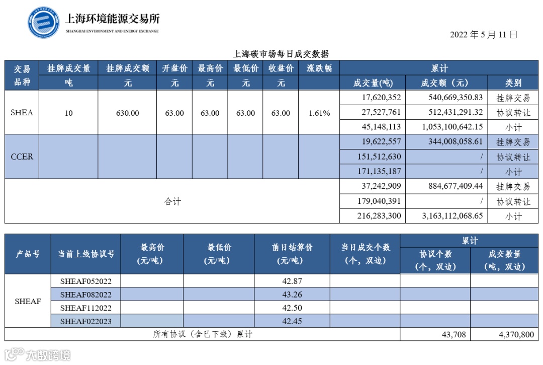 导读:今日上海碳市场SHEA挂牌交易成交10吨,成交额630.00元,收盘价63.00元/吨,较上一交易日收盘价上