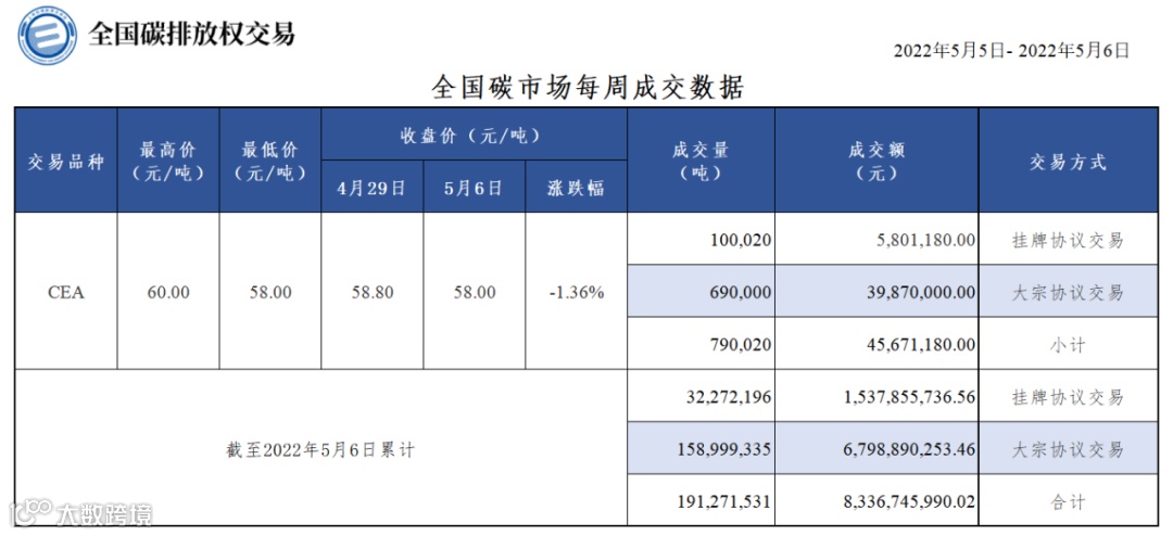 本周全国碳市场碳排放配额(CEA)总成交量790,020吨,总成交额45,671,180.00元。
