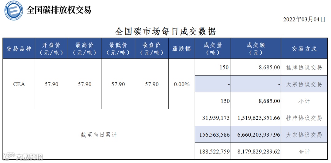 导读:今日全国碳市场碳排放配额(CEA)挂牌协议交易成交量150吨,成交额8,685.00元,开盘价57.90元/