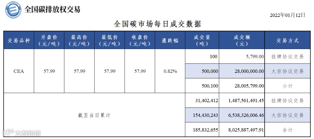 截至今日,全国碳市场碳排放配额(CEA)累计成交量185,832,655吨,累计成交额8,025,887,497.91元。