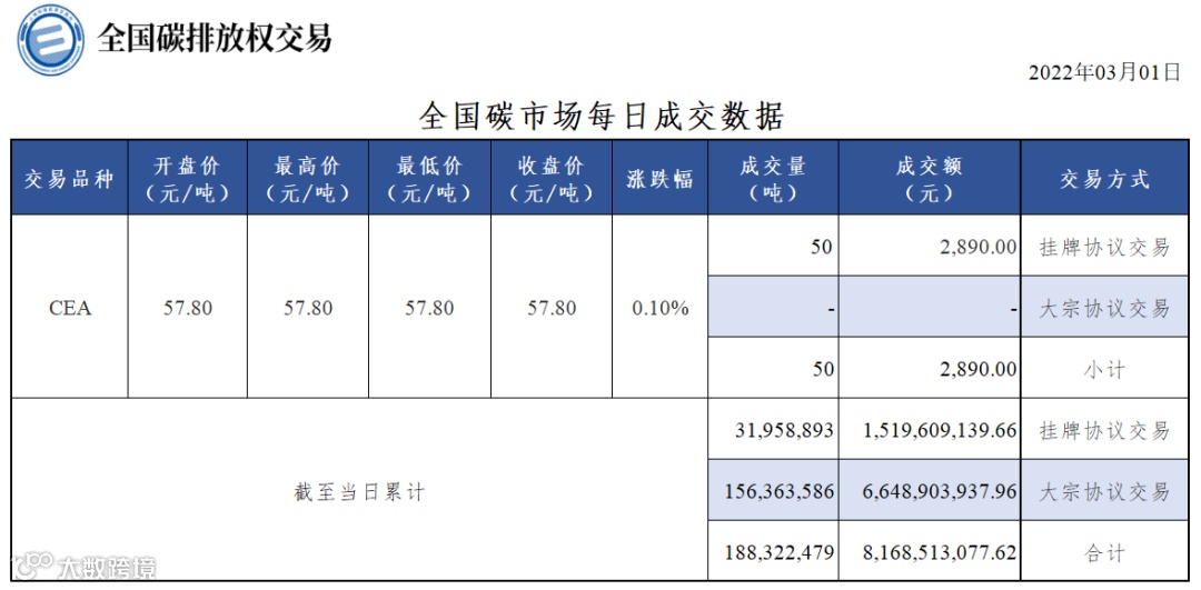 【行情】全国碳市场每日成交数据20220301