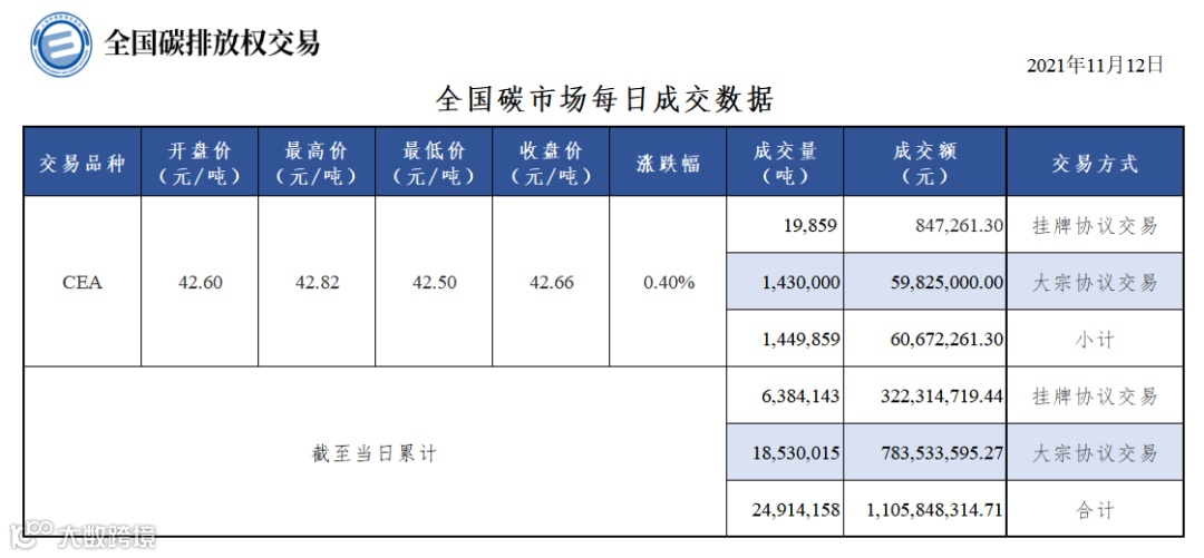 截至今日,全国碳市场碳排放配额(CEA)累计成交量24,914,158吨,累计成交额1,105,848,314.71元。