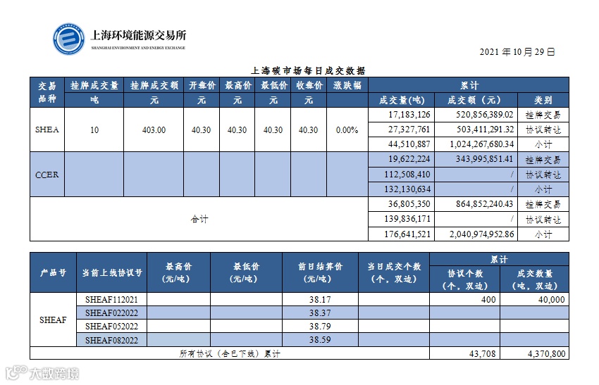 碳市场SHEA挂牌交易成交10吨,成交额403.00元,收盘价40.30元/吨,较上一交易日收盘价持平;CCER协议转让成交1,300,000吨,