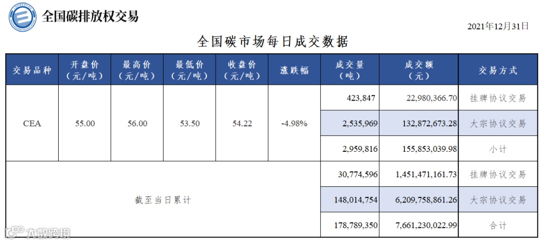 导读:今日全国碳市场碳排放配额(CEA)挂牌协议交易成交量423,847吨,成交额22,980,366.70元,开