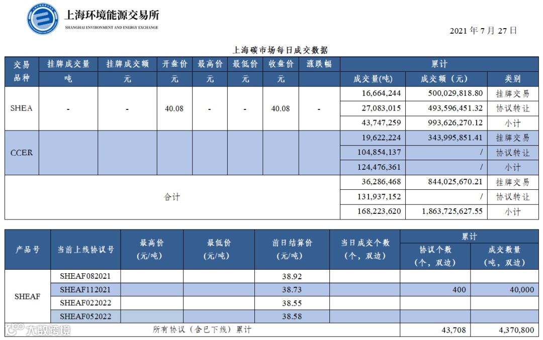 截止今日,上海碳市场所有现货品种累计成交量168,223,620吨,累计成交金额1,863,725,627.55元。其中,配额累计成交43,747,259吨,成交金额993,626,270.12元;CCER累计成交量124,476,361吨。上海碳配额远期产品累计成交数量4,370,800吨。