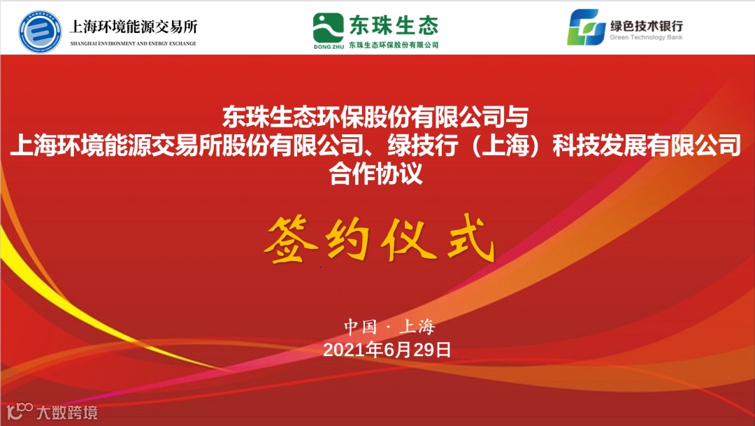 6月29日上午,上海环境能源交易所(以下简称“上海环交所”)与东珠生态环保股份有限公司(以下简称“东珠生态”)及绿技行(上海)科技发展有限公司(以下简称“绿技行”)的战略合作协议签约仪式在上海举办。上海环境能源交易所总经理刘杰、副总经理李瑾、战略与研发中心主管常征,东珠生态董事长席惠明、董事会秘书谈劭旸,绿色技术银行研究院院长倪受彬参加了签约仪式。