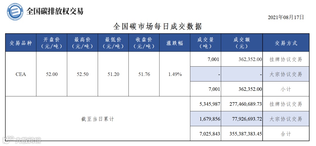 导读:今日全国碳市场碳排放配额(CEA)挂牌协议交易成交量7,001吨,成交额362,352.00元,开盘价52.