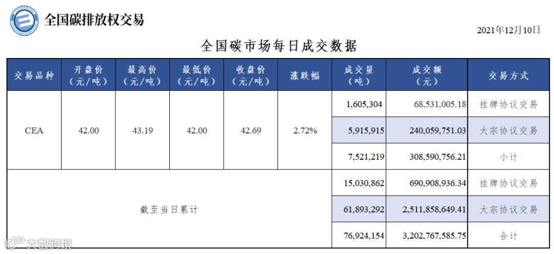导读:今日全国碳市场碳排放配额(CEA)挂牌协议交易成交量1,605,304吨,成交额68,531,005.18元
