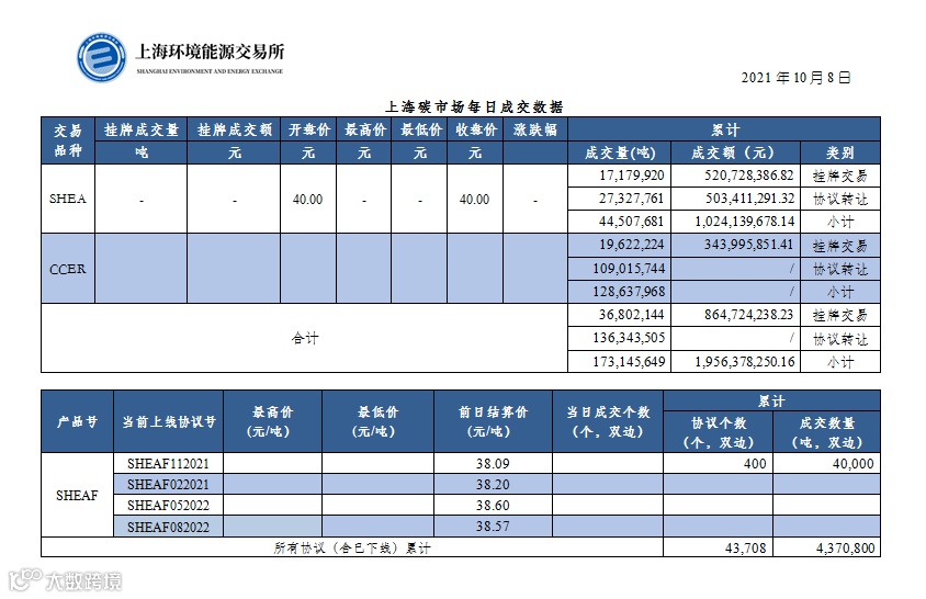 【行情】上海碳市场每日成交数据20211008