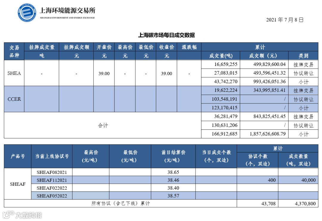 截止今日,上海碳市场所有现货品种累计成交量166,912,685吨,累计成交金额1,857,626,608.79元。其中,配额累计成交43,742,270吨,成交金额993,426,051.36元;CCER累计成交量123,170,415吨。上海碳配额远期产品累计成交数量4,370,800吨。