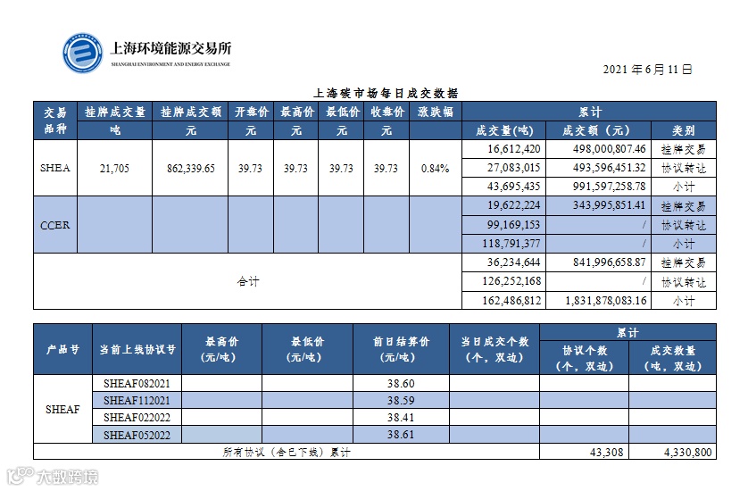 碳市场SHEA挂牌交易成交21,705吨,成交额862,339.65元,收盘价39.73元/吨,较上一交易日收盘价上涨0.84%;CCER协议转让成交376,374吨。
