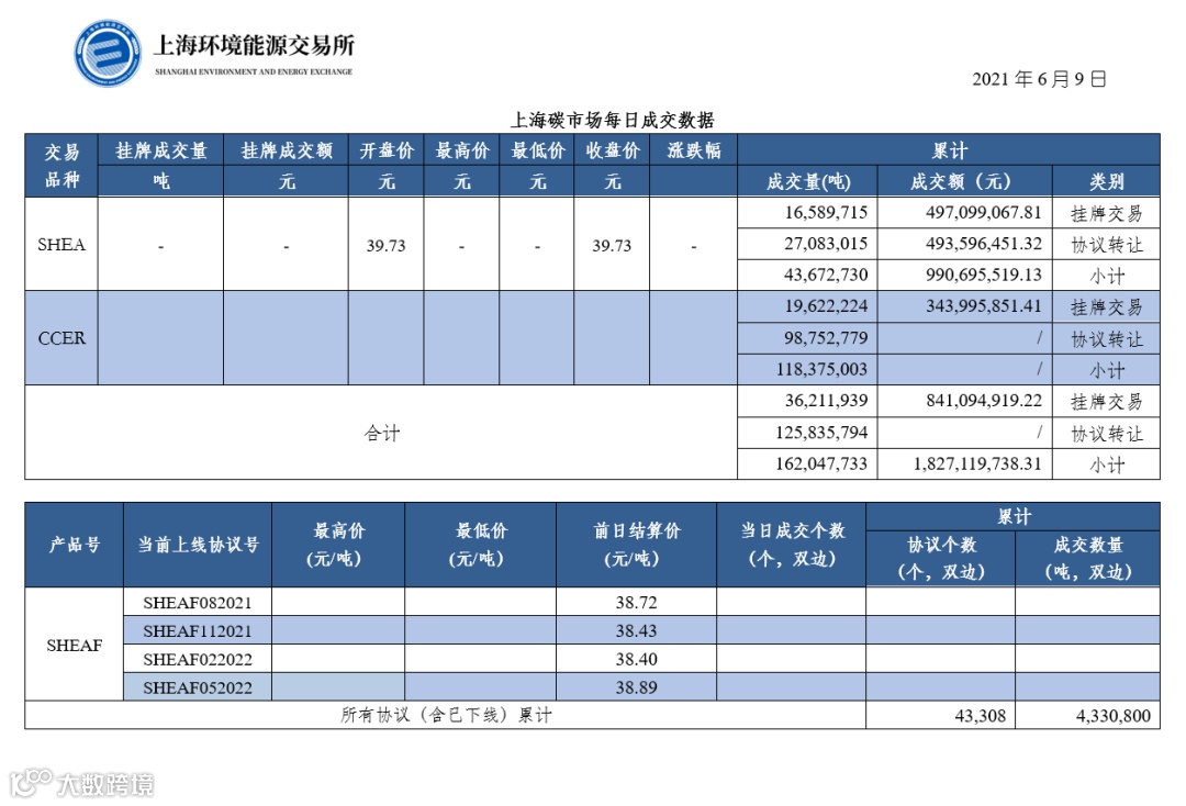 截止今日,上海碳市场所有现货品种累计成交量162,047,733吨,累计成交金额1,827,119,738.31元。其中,配额累计成交43,672,730吨,成交金额990,695,519.13元;CCER累计成交量118,375,003吨。上海碳配额远期产品累计成交数量4,330,800吨。