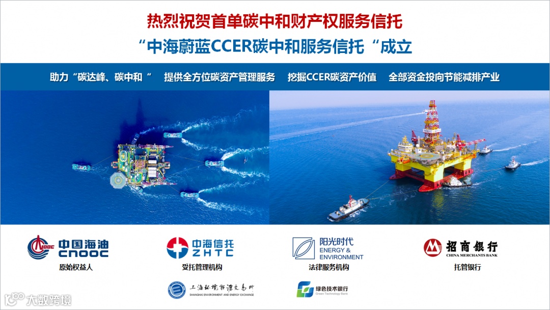 4月21日下午,中海信托股份有限公司(简称“中海信托”)与中海油能源发展股份有限公司(简称“海油发展”)举行签约仪式,双方共同宣布,全国首单以CCER为基础资产的碳中和服务信托——“中海蔚蓝CCER碳中和服务信托”正式成立。