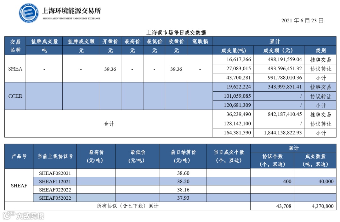 截止今日,上海碳市场所有现货品种累计成交量164,381,590吨,累计成交金额1,844,158,822.93元。其中,配额累计成交43,700,281吨,成交金额991,788,010.36元;CCER累计成交量120,681,309吨。上海碳配额远期产品累计成交数量4,370,800吨。