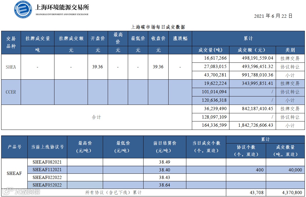 截止今日,上海碳市场所有现货品种累计成交量164,336,599吨,累计成交金额1,842,726,606.43元。其中,配额累计成交43,700,281吨,成交金额991,788,010.36元;CCER累计成交量120,636,318吨。上海碳配额远期产品累计成交数量4,370,800吨。
