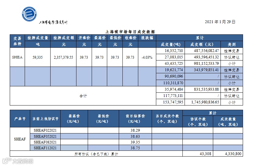 今日上海碳市场SHEA挂牌交易成交59,335吨,成交额2,357,379.55元,收盘价39.73元/吨,较上一交易日下跌4.03%;CCER协议转让成交50,000吨。