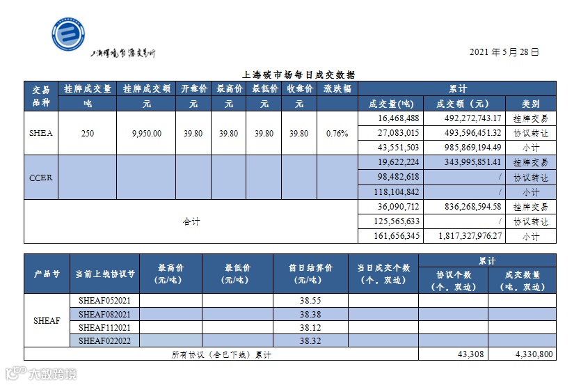 今日上海碳市场SHEA挂牌交易成交250吨,成交额9,950.00元,收盘价39.80元/吨,较上一交易日收盘价上涨0.76%;CCER协议转让成交46,007吨。